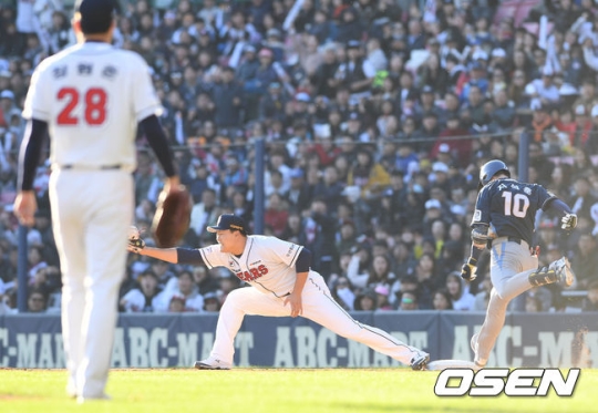 이어 오재일이 3루수 파울플라이 아웃에 그쳤으나 후속 양의지가 우중간 적시타를 쳐내며 1-0을 만들었다. 하지만 허경민이 2루수 인필드 플라이 아웃, 김재호가 좌익수 뜬공으로 각각 물러나며 추가 득점엔 실패했다. 무사 만루 기회서 한 점만 뽑은 게 두산으로서는 아쉬운 장면이었다.