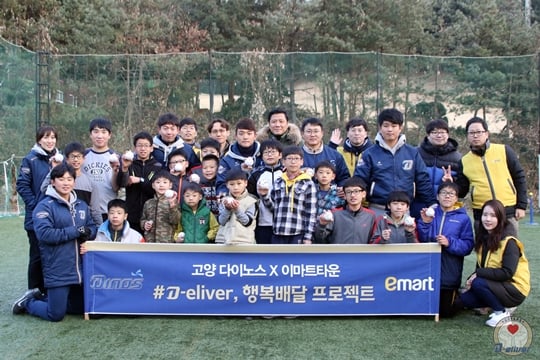 고양 다이노스와 이마트는 지난 25일 고양시에 위치한 홀트학교를 방문해 야구교실과 치어리딩 교실을 열고 500만원 상당의 생필품을 기부하는 행복배달 프로젝트를 진행했다.