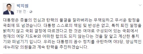 박 비대위원장은 29일 자신의 페이스북을 통해 "대통령은 촛불의 민심과 탄핵의 물결을 잘라버리는 무책임하고 무서운 함정을 국회에 또 넘겼다"며 "대통령 스스로의 책임 및 반성은 없고, 특히 퇴진 일정을 밝히지 않고 국회 결정에 따르겠다고 한 것은 여야로 구성되어 있는 국회에서 현재의 여당 지도부와 어떠한 합의도 되지 않는다는 것을 잘 알고 계산한 퉁치기와 떠넘기기"라고 지적했다.
