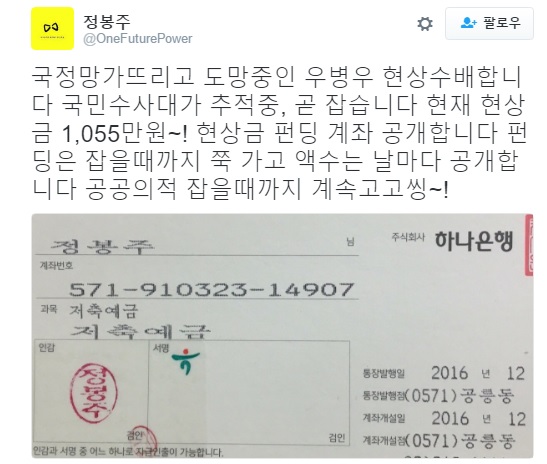 국회 최순실 국정 농단 국조특위 청문회에 증인 출석을 요구받고도 잠적한 우병우 전 청와대 민정수석의 거취가 묘연한 가운데 우 전 수석 찾기에 시민들도 발벗고 나섰다. 국조특위 위원장인 김성태 의원과 안민석 의원, 정봉주 전의원 등이 우 전 수석의 행방에 현상금을 걸었고 이에 시민들도 동참하면서 현상금은 12일 현재 1400만원을 넘어섰다.