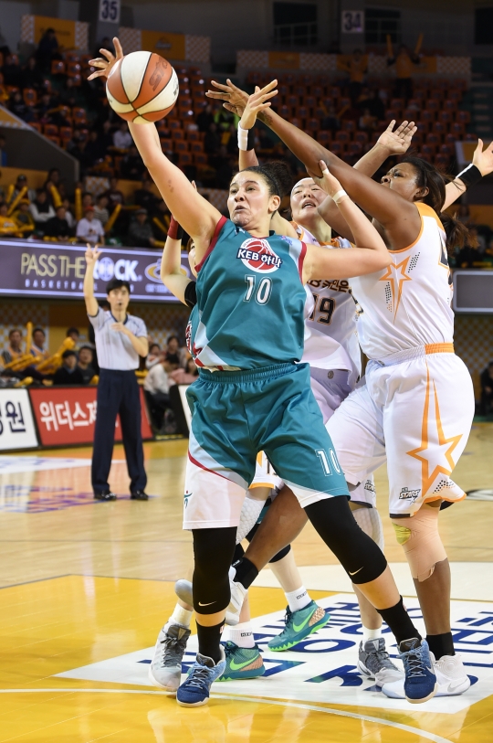 KEB하나는 4쿼터 KB스타즈의 거센 반격에 흔들렸다. 어천와가 연속 득점을 기록했지만 박지수의 골밑 공격이 살아나면서 고전하기 시작했다. 심성영에게 3점슛을 내주며 추격을 허용하고 말았다. 그러자 KEB하나는 노련한 쏜튼을 투입했다. 쏜튼은 점수 차를 지키는 운영을 보였다. 무리하게 공격을 시도하기 보다는 시간을 최대한 활용하는 공격을 펼쳤다. 그러면서 강이슬의 득점도 나왔고 KEB하나는 60-46으로 리드를 지켜나갔다. 마지막까지 KB스타즈의 추격이 매서웠지만 김정은의 3점포를 앞세운 KEB하나는 승리의 기쁨을 누렸다.