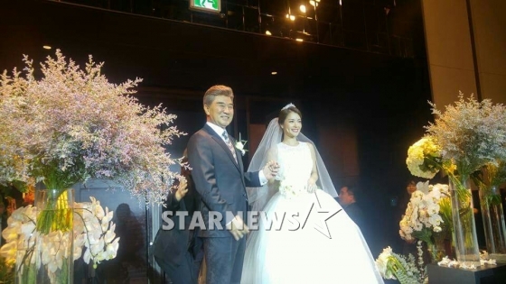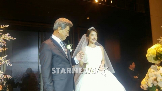 공개된 사진에는 신부 입장을 앞두고 이덕화가 딸 이지현의 손을 잡고 행복해하고 있다.