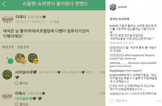 이수진씨는 "가끔씩 들리는 슈퍼맨 밴드에 재시를 사칭하며 장난을치는 사람이있다"며 "재시가 알면 겁이 날 것 같다. 사칭하는 분은 이런 장난 그만하라"고 경고했다.