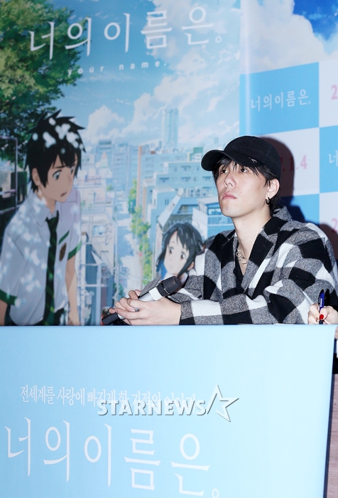 '너의 이름은' OST를 부른 일본 그룹 래드윔프스의 노다 요지로가 18일 오전 서울 중구 동대문 메가박스에서 진행된 영화 '너의 이름은(감독 신카이 마코토)' 흥행 감사 기자간담회에 참석해 질의응답을 하고 있다.