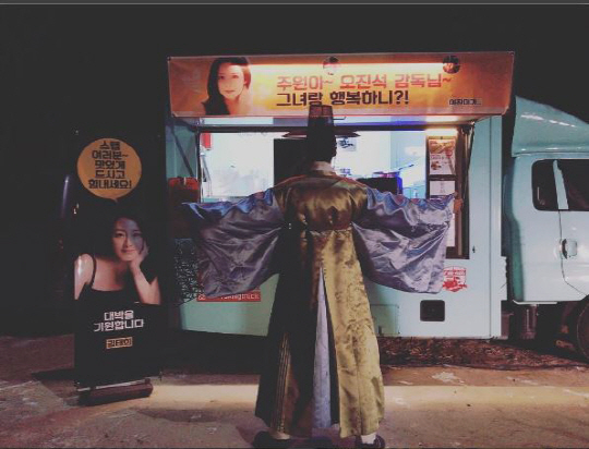 눈길을 끄는 대목은 바로 커피차와 함께 전해진 현수막 속 문구. 김태희는 이 현수막에 자신의 사진과 함께 "주원아~ 오진석 감독님~ 그녀랑 행복하니?!"라는 문구를 담았다.