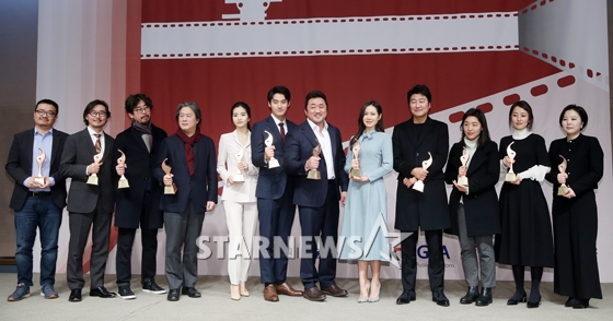 연상호 감독, 폭스인터내셔널 프로덕션 코리아 김호성 대표, 나홍진 감독, 박찬욱 감독, 배우 김태리, 정가람, 마동석, 손예진, 송강호, 윤가은 감독, 박미애 기자, 양지혜 팀장이 18일 오후 서울 중구 프레스센터에서 진행된 '제8회 올해의 영화상' 시상식에 참석해 포즈를 취하고 있다.