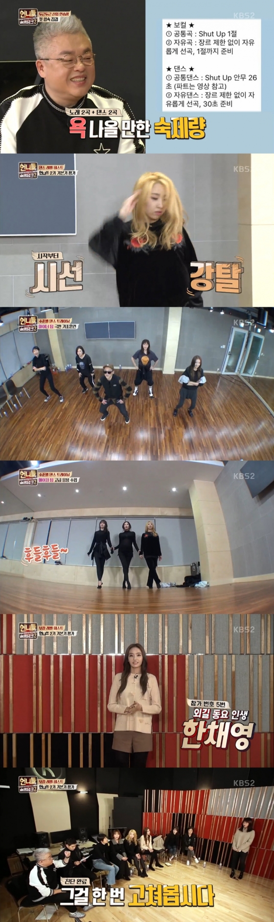 이날 방송에서 멤버들은 보컬 및 댄스 레벨 테스트를 받았다. 언니쓰 멤버들에게 가장 먼저 찾아온 선생님은 안무계 최고 실력자 김화영과 김규상이었다.