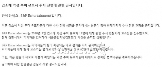 소속사는 "최근 김소혜 악성 루머 유포자들에 대한 수사 진행 사항을 문의하시는 분들이 많아 현재까지의 수사 진행 현황을 공지한다"며 "S&P엔터테인먼트는 2016년 9월 김소혜 악성 루머 유포자 11명에 대해 관할 수서 경찰서에 고소장을 접수했으며 현재 경찰서에서 피의자를 검거하여 서울중앙지방검찰청에 사건을 송치한 상황"이라고 밝혔다.