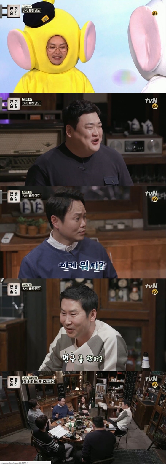 16일 오후 방송된 tvN '인생술집'에는 한채아와 김민교가 출연했다. 김민교는 'SNL 코리아 9(이하 'SNL')'의 크루다. MC 신동엽과 김준현도 마찬가지다. '인생술집'의 또 한 명의 진행자 탁재훈도 지난 시즌까지 'SNL'에 출연했다. 에릭남 또한 'SNL' 호스트로 출연한 경험이 있다. 그래서 '인생술집' MC들은 이날 방송을 통해 김민교가 'SNL'에 출연하며 느낀 감정들을 제 일처럼 공감해주었다.