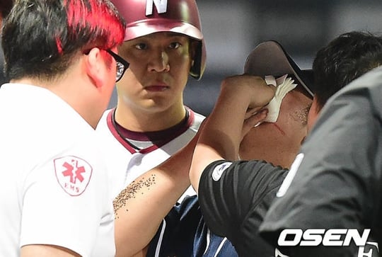 김명신은 지난 25일 1회 2사 1,2루 상황서 김민성의 타구에 광대뼈 쪽을 맞으며 골절되는 부상을 입었다. 경기 도중 타구를 친 김민성도 크게 놀라긴 마찬가지였다. 당시 김민성은 경기가 진행 중이라는 것도 잊은 채 곧바로 마운드를 향해 달려가는 모습을 보이기도 했다.