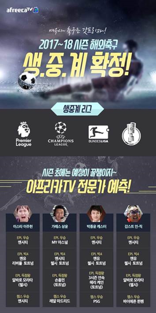 아프리카TV는 11일 "2017~2018 시즌 잉글랜드 프리미어리그(이하 EPL)와 독일 프로축구 리그(이하 분데스리가), UEFA 챔피언스리그까지 해외 축구 ‘빅3’를 모두 생중계한다"고 밝혔다.