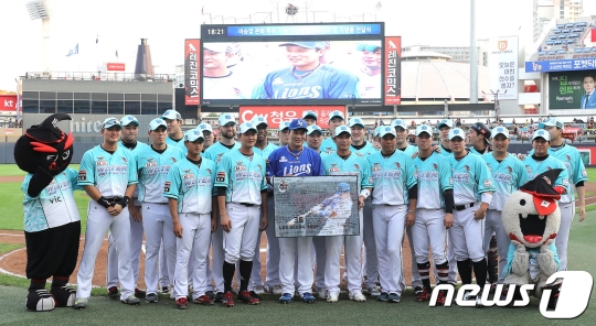 마지막으로 kt 주장 박경수는 이승엽 사진 508장을 합쳐 만든 기념사진 액자를 전달했다. 유한준, 김재윤 등 kt 선수 20명이 이승엽에게 축하 메시지도 담았다.