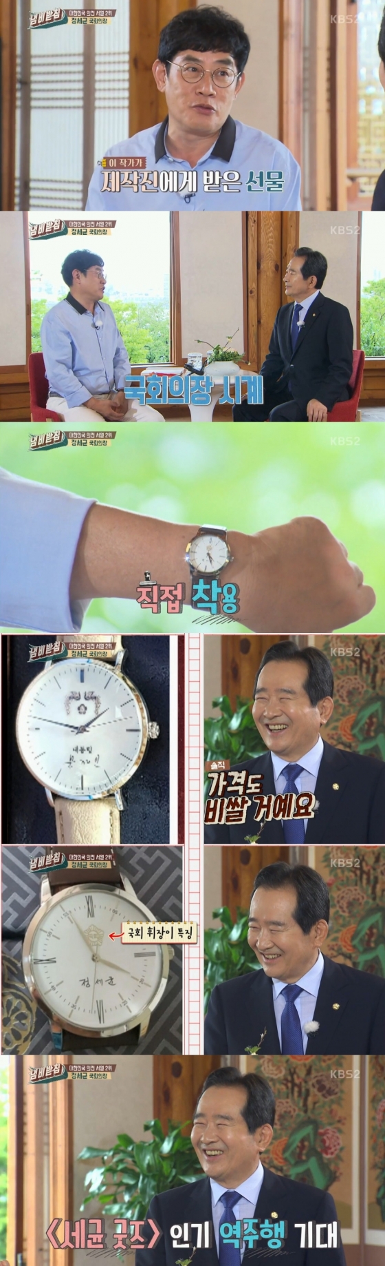 이에 정세균 국회의장은 "(문재인 대통령의 시계가) 가격도 더 비쌀 것이다"라며 "국회의장의 시계는 인기가 없는데 이경규씨가 차줘서 문의가 많아질 것 같다"라고 좋아했다.