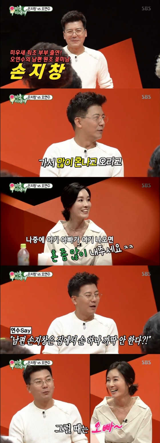 17일 오후 방송된 SBS 예능 프로그램 '미운 우리 새끼'에서 오연수의 남편 손지창이 출연해 아내의 이야기에 대한 해명을 했다. 손지창은 아내에 대한 칭찬도 빼놓지 않으며 애정을 드러냈다.