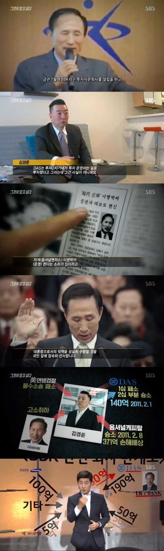 30일 방송된 SBS 교양프로그램 '그것이 알고 싶다'에서 피해자들에게 돌아가야할 BBK 투자금이 이명박 전 대통령의 친형의 기업인 DAS로 흘러갔다는 점을 추적했다.