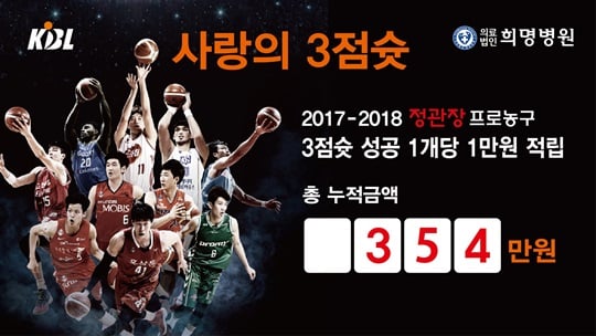 KBL과 희명병원이 사회 공헌 활동의 일환으로 시작한 이번 캠페인은 KBL 소속 10개 구단이 모두 동참하며, 3점슛 1개당 1만원이 적립된다.