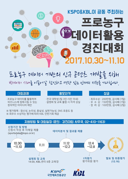 KBL이 프로농구 데이터 기반의 신규 콘텐츠 개발을 위해 KSPO와 프로농구 데이터 활용 경진대회를 공동 주최한다.