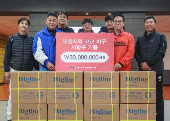 롯데 자이언츠가 7일 사직야구장에서 부산지역 내 고등학교 야구부에 총 3천만원 상당의 야구용품을 전달했다.