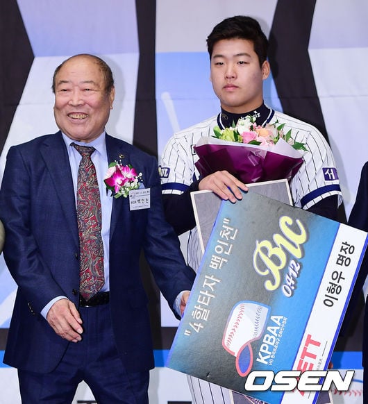 강백호는 지난 7일 낮 12시 서울 양재동 L-타워 7층 그랜드홀에서 열린 '2017 레전드 야구존 한국프로야구 은퇴선수의 날'에서 'BIC0.412'(백인천상)을 수상했다. OPS 1.000 이상, 60타수, 타율 4할 이상 기록한 고교·대학야구선수 중 한 명에게 상이 돌아가는데, 강백호가 이 상을 수상했다.