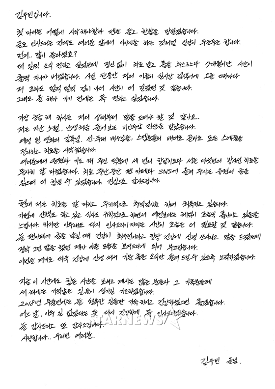 김우빈은 29일 오후 다음 팬카페 우리빈을 통해 직접 쓴 장문의 글을 게재했다. 그는 "더 일찍 소식 전하고 싶었는데 정신 없이 치료 받고 몸을 추스르느라 7개월이란 시간이 훌쩍 지나가 버렸습니다"라고 전했다.