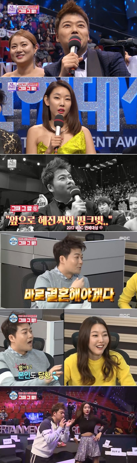 달달한 분위기가 가장 무르익었던 건 지난해 연말 MBC 연예대상 시상식이었다. 무대에 올랐던 이국주가 전현무를 향해 "이 정도 밀어줬으면 고백해야 하는 것 아니냐"고 한혜진과의 관계에 대해 짓궂게 질문하자 전현무는 "어떻게 될지 모르겠지만 기안84-박나래 커플이 치고 올라와 위기감을 느낀 것은 사실이다"라고 털어놨다. 이어 "1년 동안 괜찮았다. 썸도 있었고 위기도 있었다"고 말했다. 이어 '한혜진에게 전현무란'이란 질문을 받은 한혜진이 "연예인"이라고 답하자, 전현무는 타이밍을 놓치지 않고 "그녀만의 연예인이에요"라고 응수하기도 했다.