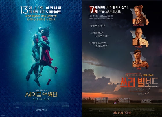 '셰이프 오브 워터' '쓰리 빌보드' 모두 올해 굵직한 영화 시상식에서 작품상, 감독상 외에도 남녀 주연상 등 주요 부문에서 맞붙고 있다. 이에 이번 아카데미 시상식에서는 누가 승자로 미소를 지으며 트로피를 잡는 영예를 누릴지 전세계 영화 팬들의 이목이 쏠리고 있다.