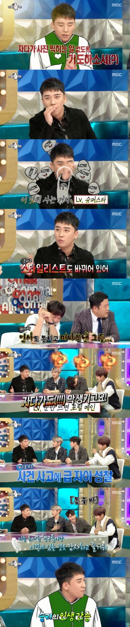 빅뱅 멤버 중 유일하게 이날 게스트로 출연하며 2년 만에 상석에 앉았다는 승리는 이날 "이런말 하기 싫지만 멤버들 군대 가니까 살맛 납니다"라는 폭탄 발언으로 포문을 열었다.