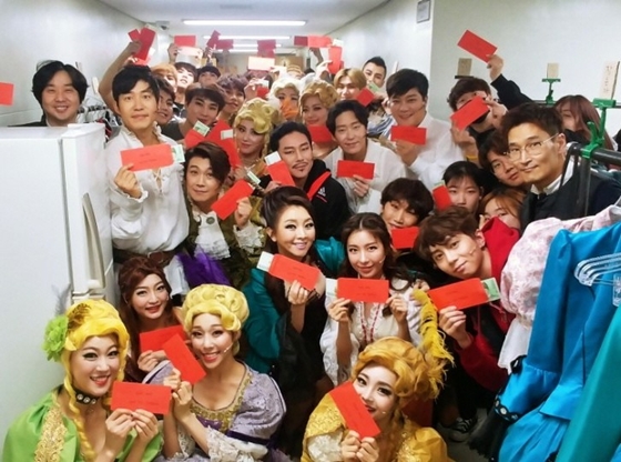 공개된 사진 속 배우들은 전석 매진에 감사하는 마음을 담아 제작사 측에서 지급한 '만원사례' 봉투를 손에 든 채 환한 미소로 카메라를 응시하고 있어 눈길을 끈다.