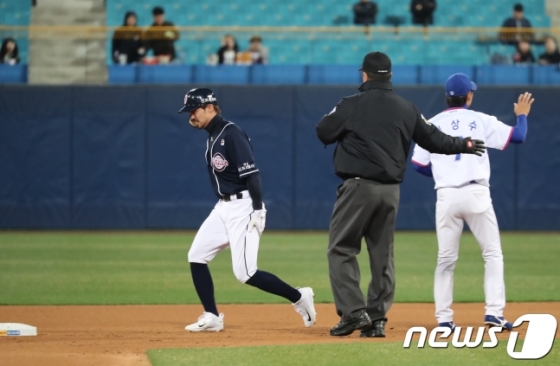 두산의 4회초 공격. 2사 2루 기회. 오재원이 보니야를 상대로 1루수 오른쪽을 뚫고 빠져나가는 2루타를 쳐냈다.
