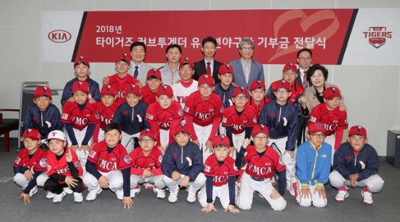 이날 KIA와 기아차는 지난 2017년 '타이거즈 러브투게더'를 통해 적립한 기금(5억 3000만 원) 중 일부인 7500만 원을 광주YMCA 유소년 야구단 지원금으로 전달했다.