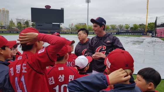 경기 취소에도 이날 등판 예정이었던 레일리는 정상적으로 훈련을 소화했다. 훈련을 하던 도중 레일리는 롯데 구단 관계자에게 펜을 빌려 사인공 3개를 준비했다. 이후 사인공을 들고 3루 덕아웃 앞으로 향했다. 3루 덕아웃 앞에는 이날 KIA '타이거즈 러브투게더' 행사에 참가한 광주YMCA 유소년 야구단 선수들이 있었다.