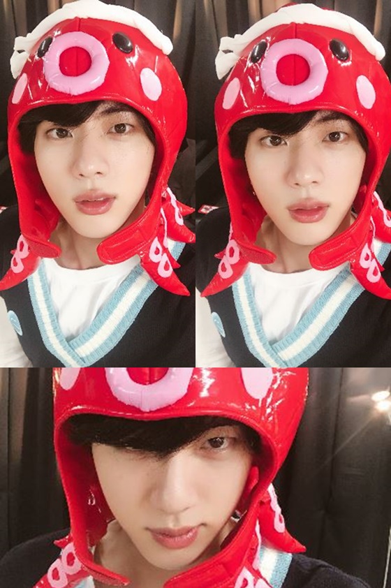 공개된 사진 속 진은 붉은색 문어 캐릭터 모자를 쓰고 셀카를 찍고 있다. 귀여운 캐릭터 모자에도 사려지지 않는 훈훈한 미모가 여심을 자극했다. 깨끗한 피부에 뚜렷한 이목구비를 가진 진의 청초한 표정 또한 눈길을 끌었다.
