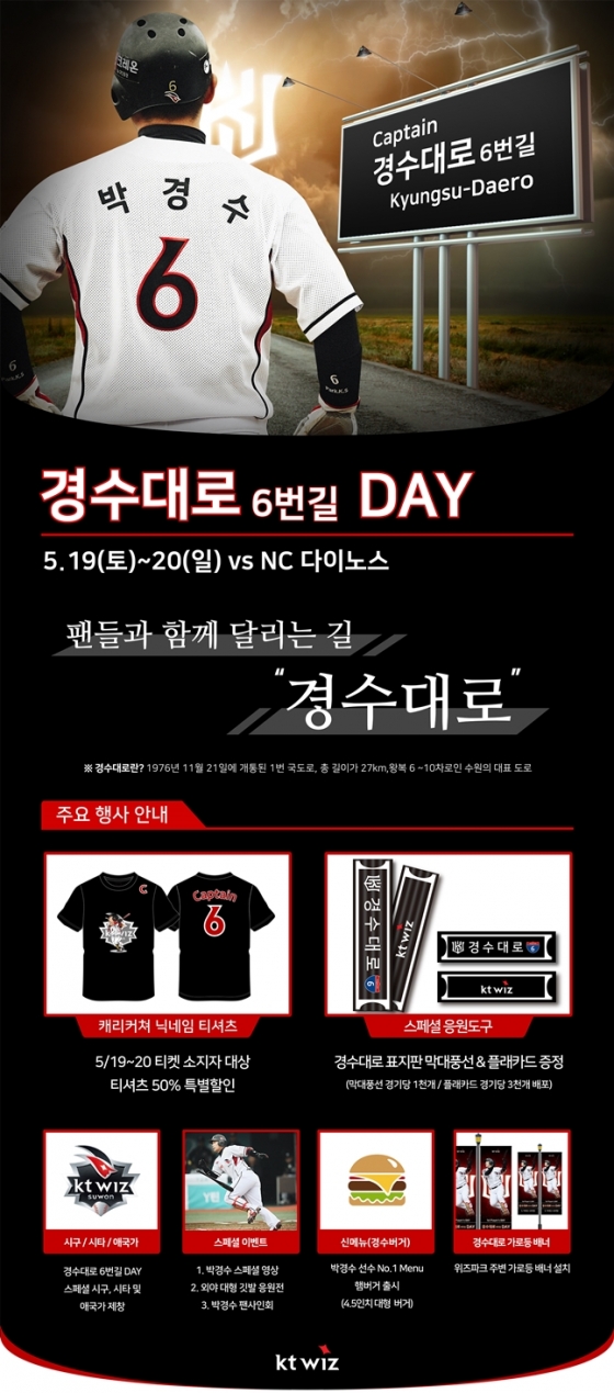 10일 KT에 따르면 '선수 데이' 영예의 제1호 주인공은 '캡틴' 박경수로, '경수대로 6번길 DAY!'을 진행한다. 선수 데이 행사는 팬들의 사랑에 보답하고 팬과 선수가 더욱 가까워지는 계기로서 기획됐다.