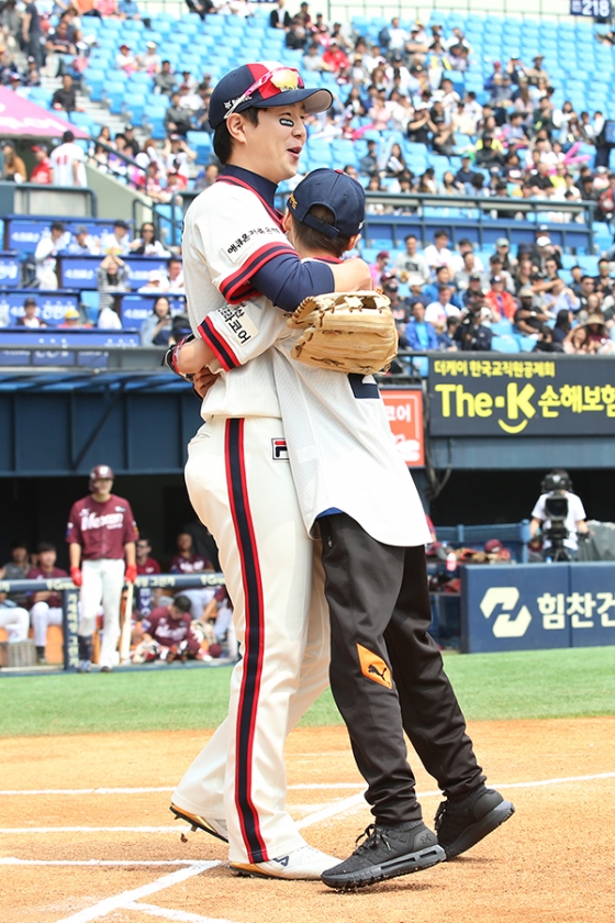 노바운드로 던진 공을 잡아낸 박건우는 이내 일어선 뒤 헌덕 군을 향해 두 팔을 벌려 보였다. 그런 그를 향해 김헌덕 군이 아기처럼 뛰어간 뒤 품속에 안겼다. 근처에 있는 박건우도, 나광남 구심도, 양의지도, 상대 타자 이정후도 행복한 듯 얼굴에서 미소가 떠나질 않았다.