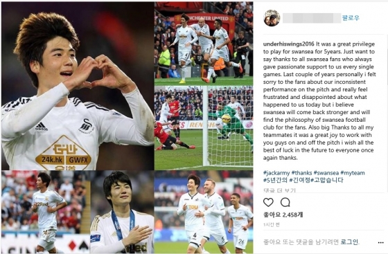 기성용은 14일 자신의 인스타그램에 스완지시티 팬들을 향한 작별 인사말을 올렸다.