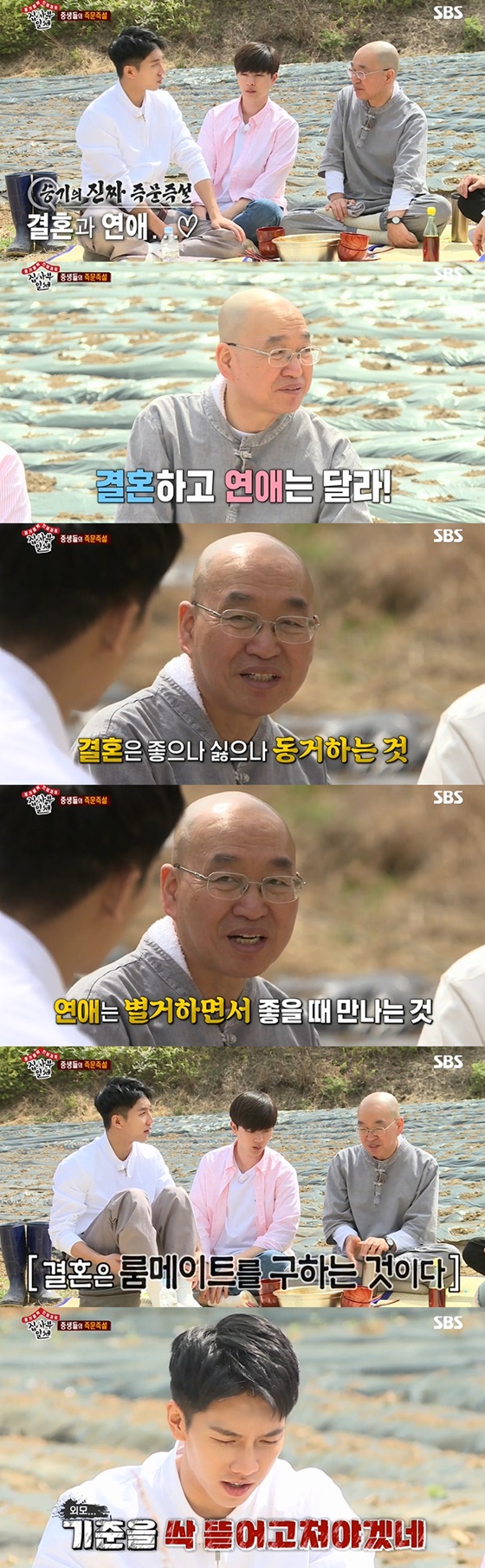 '집사부일체' 9대 사부 법륜스님이 "결혼은 룸메이트를 구하는 일"이라고 조언했다.
