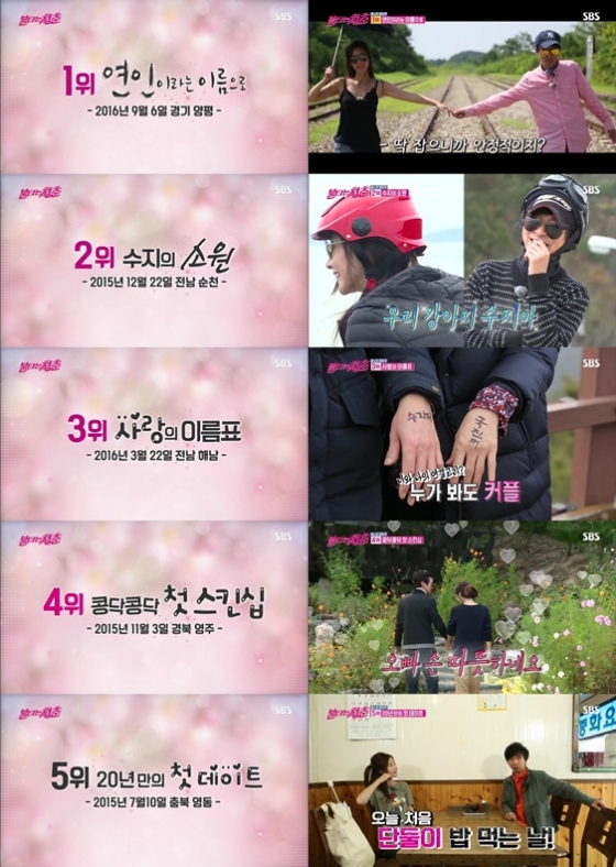 두 사람이 방송을 통해 첫 스킨십을 한 건 2015년 11월이었다. 오목내기로 서로의 소원을 들어주기로 한 국진은 수지의 소원이 "손을 잡고 산책하기"라는 이야기를 듣고 내기에서 일부러 져준 것. 스태프들 앞에서 어색하게 처음 손을 잡은 수지는 국진에게 "오빠 손 따뜻하네요"라고 말해 설렘을 안겨주었다.