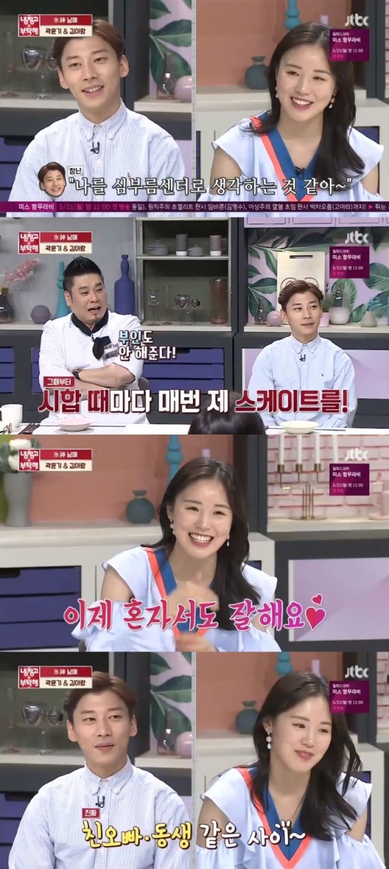 14일 오후 방송된 종합편성채널 JTBC 예능프로그램 '냉장고를 부탁해'에서는 게스트로 출연한 곽윤기와 김아랑이 친오빠, 동생 같은 모습을 보여줬다.