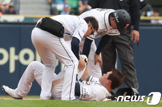 한참을 고통을 호소한 국해성은 다시 일어나기는 했다. 두산의 트레이너와 코치가 나와 국해성의 상태를 확인했다. 국해성 스스로는 경기 강행 의지를 드러냈지만, 쉽지 않았고, 들것에 실려 교체됐다.