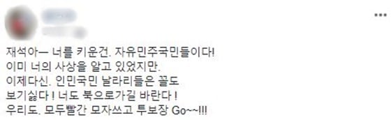 이 네티즌은 유재석 사진 밑에 "재석아 너를 키운건 자유민주국민들이다. 이미 너의 사상을 알고 있었지만, 이제 다신 인민국민 날라리들은 꼴도 보기 싫다. 너도 북으로 가길 바란다. 우리도 모두 빨간 모자 쓰고 투표장 GO~"라고 적었다. 유재석이 자유한국당을 상징하는 빨간색이 아닌 더불어민주당을 상징하는 파란색 모자를 쓴 점을 못마땅해한 것으로 보인다.