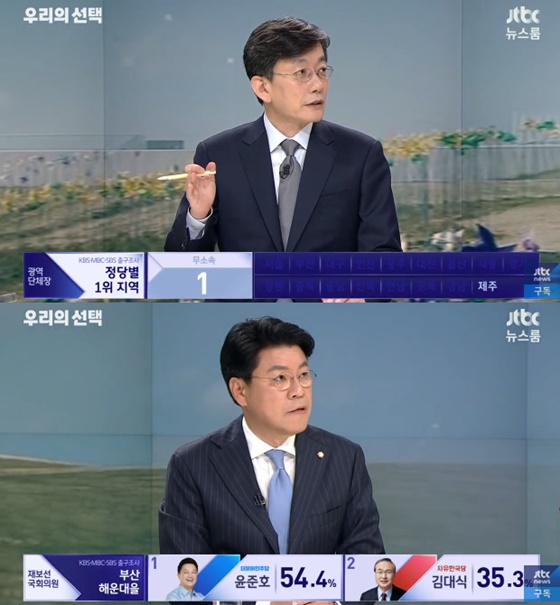 출구조사 결과를 본 손석희 앵커는 "한 마디로 정리하자면 이른바 진보성향에 일방적으로 흘러간 선거다라는 생각을 갖게 한다"라며 "장제원 의원이나 다른 야당의원 말씀처럼 야권은 현실적으로 정치권 재편을 논하기 앞서서 흔히 스탠스를 다시 잡아야한다는 말을 해주셨다"라고 설명했다.