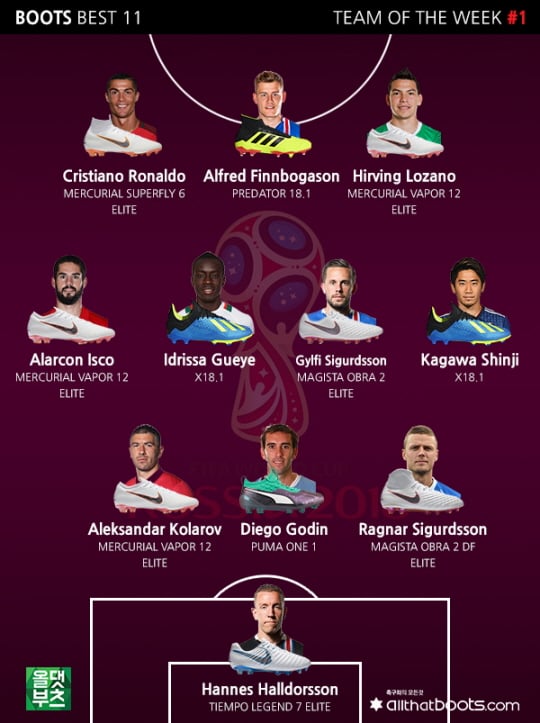 축구 용품 브랜드 입장에서 볼 때 자신들의 브랜드 로고를 새긴 축구화를 착용한 선수들이 뛰어난 활약을 펼치는 것을 간절히 바라고 있을 것이다. 월드컵은 축구 전쟁이 벌어지는 곳이지만 제 2의 전쟁인 ‘브랜드 홍보 전쟁’이 벌어지는 곳이기도 하기 때문이다. 그렇다면 월드컵 조별리그 1차전에서는 어떤 브랜드들이 웃었을까? 조별리그 1차전 최고의 활약을 펼친 선수들이 착용한 축구화를 기반으로 ‘축구화 베스트 11’을 선정해봤다.