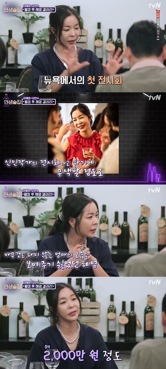이에 이혜영은 "뉴욕에서 몇 개 팔렸는데 제일 비싸게 팔린 작품은 2000만원정도다"라고 말해 출연진들을 놀라게 했다. 이어 "제가 그림을 잘 안 판다. 제가 너무 힘들때 그린 작품이라서 남편이 못팔게 한다. 거기에 다 쏟아부어서 그린 거라는 걸 남편이 알아서 못 팔겠다고 하더라"라고 전했다.