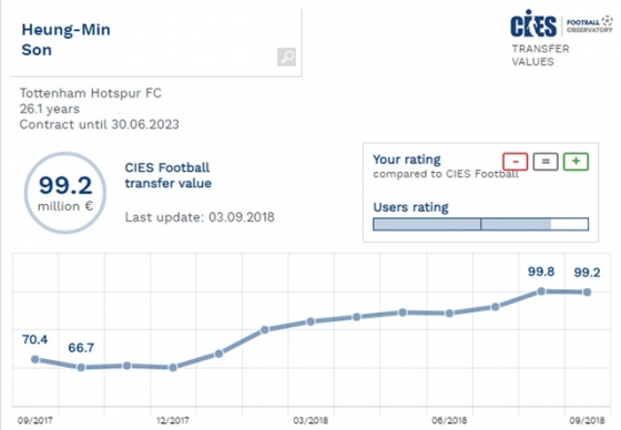 아쉽게도 9월 새롭게 업데이트된 손흥민의 예상 이적시장 몸값은 다소 하락한 9920만 유로로 평가됐다. 아쉬움이 있지만 유럽축구 활약이 기본적인 바탕이 되는 만큼 아시안게임 차출로 잉글리시 프리미어리그 경기를 소화하지 않았던 점을 감안하면 큰 하락폭이 아니다.