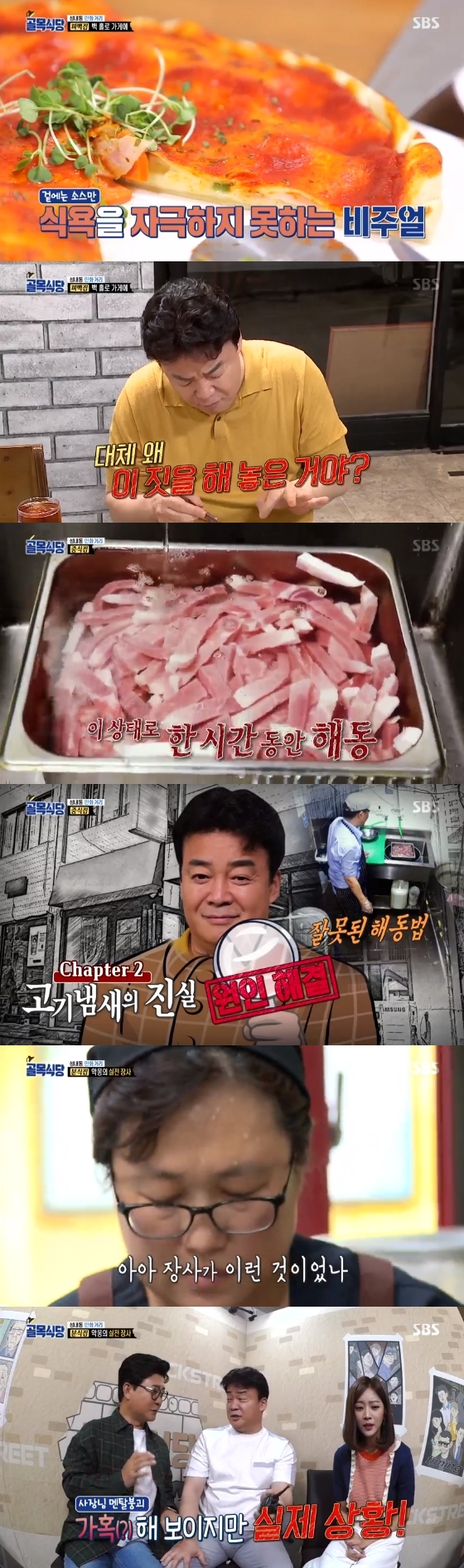중식집 사장을 직접 만난 백종원은 "사장님 혹시 고기 밑간할 때 맨손으로 했냐"라고 물었다. 중식집 사장은 "라텍스 장갑을 낄 때 있고 안 할 때도 있다"고 답했다. 이에 중식집 사장은 "고기 피를 빼기 위해 물에다 담가놨다"고 말했다. 백종원은 "그러니깐 상하는 거다. 물에 해동할 경우 비닐에 고기를 넣은 상태에서 해동시켜야 한다"고 말했다.