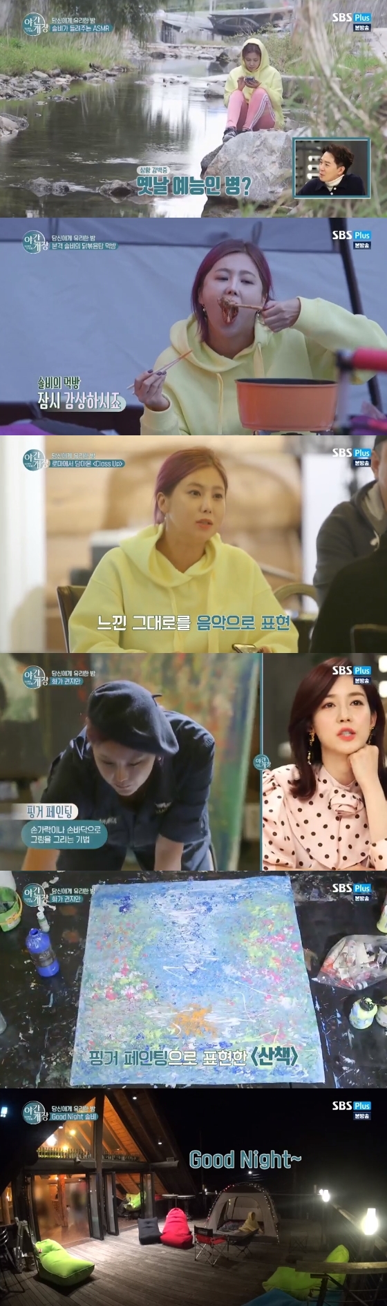 몇 시간 뒤 혼자 남은 솔비는 핑거 페인팅(손가락이나 손바닥으로 그림을 그리는 기법)을 했다. 솔비는 평소와 달리 진지한 모습을 보이기도 했다. 솔비는 오늘 산책한 기억을 토대로 작품 '산책'을 완성했다. 스트레칭을 마친 솔비는 텐트에서 잠들었다.