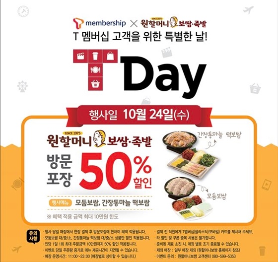 원할머니보쌈·족발 측은 SK텔레콤 T멤버십 고객을 대상으로 T데이 할인 행사를 진행한다고 지난 22일 밝혔다. 이번 행사는 24일 단 하루만 진행한다. T멤버십 전 등급 고객을 대상으로 원할머니보쌈·족발 메뉴 중 모둠보쌈과 간장통마늘 떡보쌈을 50% 할인 혜택을 제공한다.