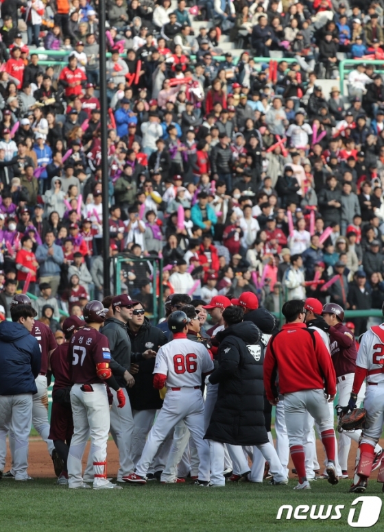 지난 플레이오프 1차전에 이은 두 번째 벤치클리어링이었다. 이 과정에서 김성현이 샌즈를 향해 가운데 손가락 욕을 하는 볼썽사나운 모습이 연출되기도 했다.