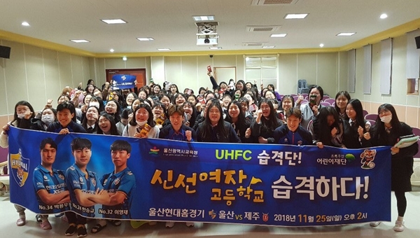 울산은 최근 울산여고와 신선여고를 방문해 “UHFC 습격어택” 행사를 진행했다. 학교 습격 행사는 사전 신청을 받은 학교에 선수단이 깜짝 방문하여 학생들과 함께 이벤트와 간단한 게임을 즐기는 식으로 진행된다.