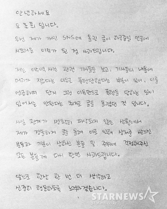 그는 자필 사과문을 통해 "제가 개인 SNS에 올린 글이 하루종일 언론에 시끄러운 이슈가 된 점 사과드립니다"고 밝혔다.